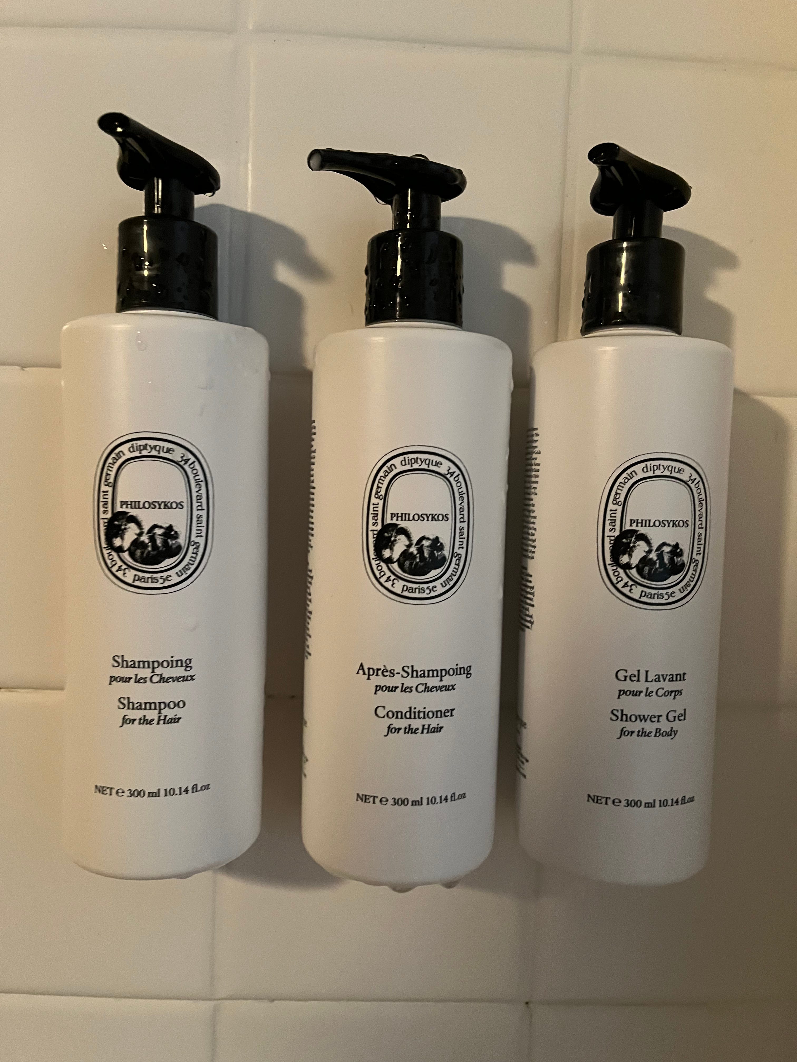 You know, this is one I never thought about much. Do I pack my own shampoo? No. Do I blow-dry my hair? No. Do I still have the same haircut as when I was 12? Yes. But let me tell you, all hotel shampoos are not created equal. In the lead, by a country mile—Palihouse, in Santa Monica, had Diptyque bath products. Diptyque! I took enough bottles of hand cream to last for months. I would have taken shampoo, but it was attached to the wall. A++, 10/10.